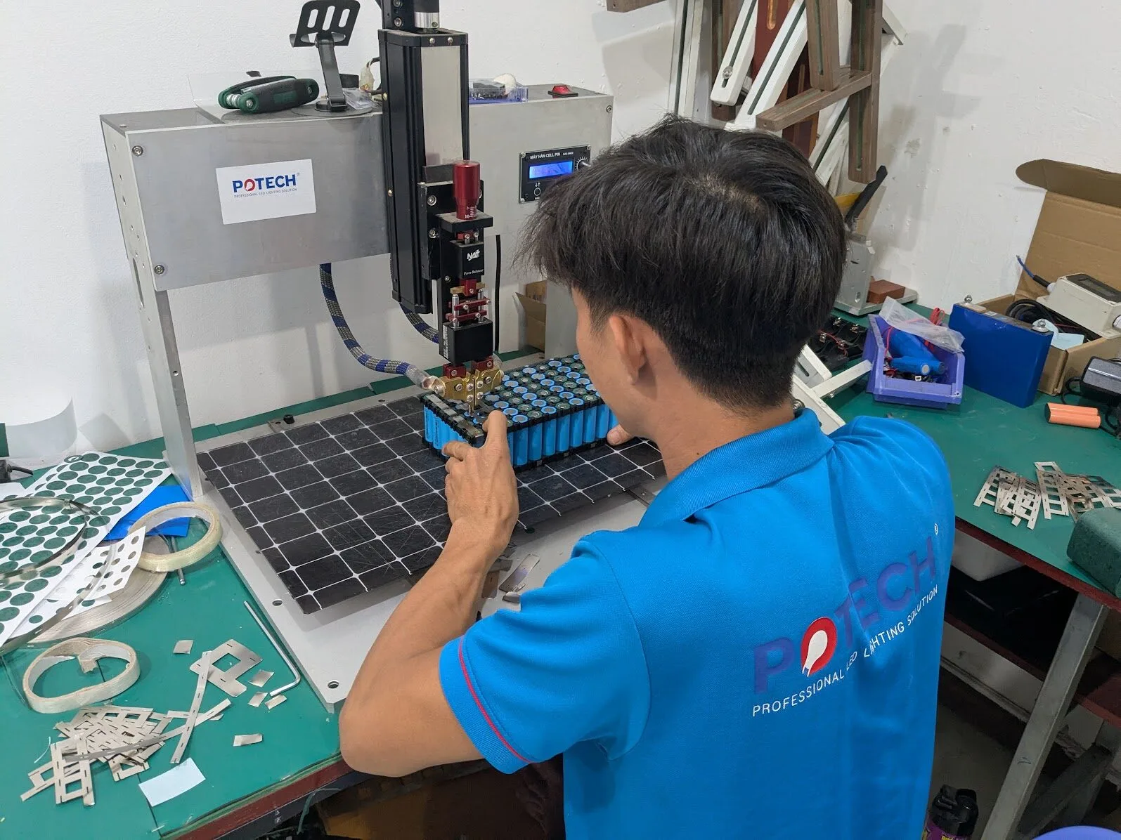 Hàn cell bằng máy hàn điểm chuyên dụng, kết nối đúng kỹ thuật, đảm bảo an toàn tuyệt đối.